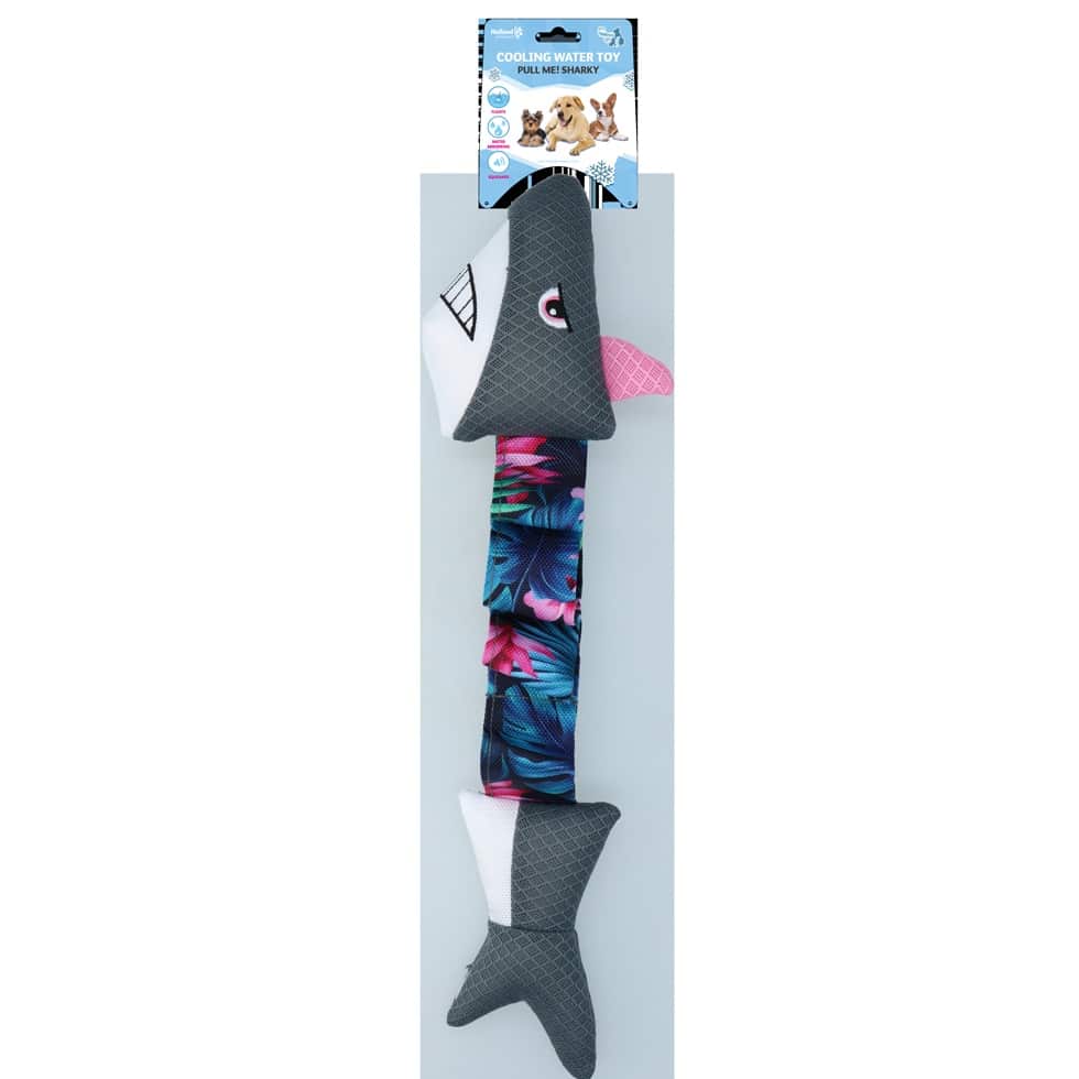 Je hond slaat zo een haai aan de haak! De stoere haai bijt gelukkig niet, maar drijven kan ie wel. Het speeltje kan dus zo mee het water in. Ook neemt het water op, wat vrij komt zodra de hond de haai in de bek neemt. Zo droogt de hond niet uit tijdens het spelen met de Pull Me! Sharky. Het speeltje is zelfs inzetbaar tijdens trekspelletjes; de stevige pieper en de elastische veer voegen extra plezier toe!