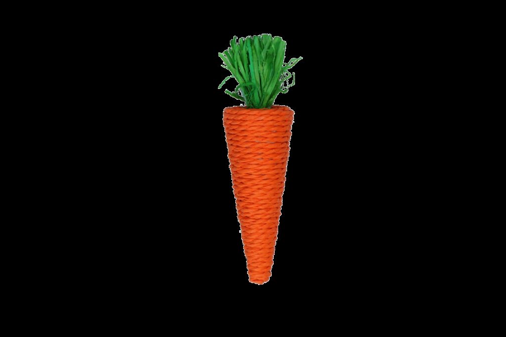 Vrolijk gekleurde wortel met loof om mee te spelen en lekker aan te knagen.